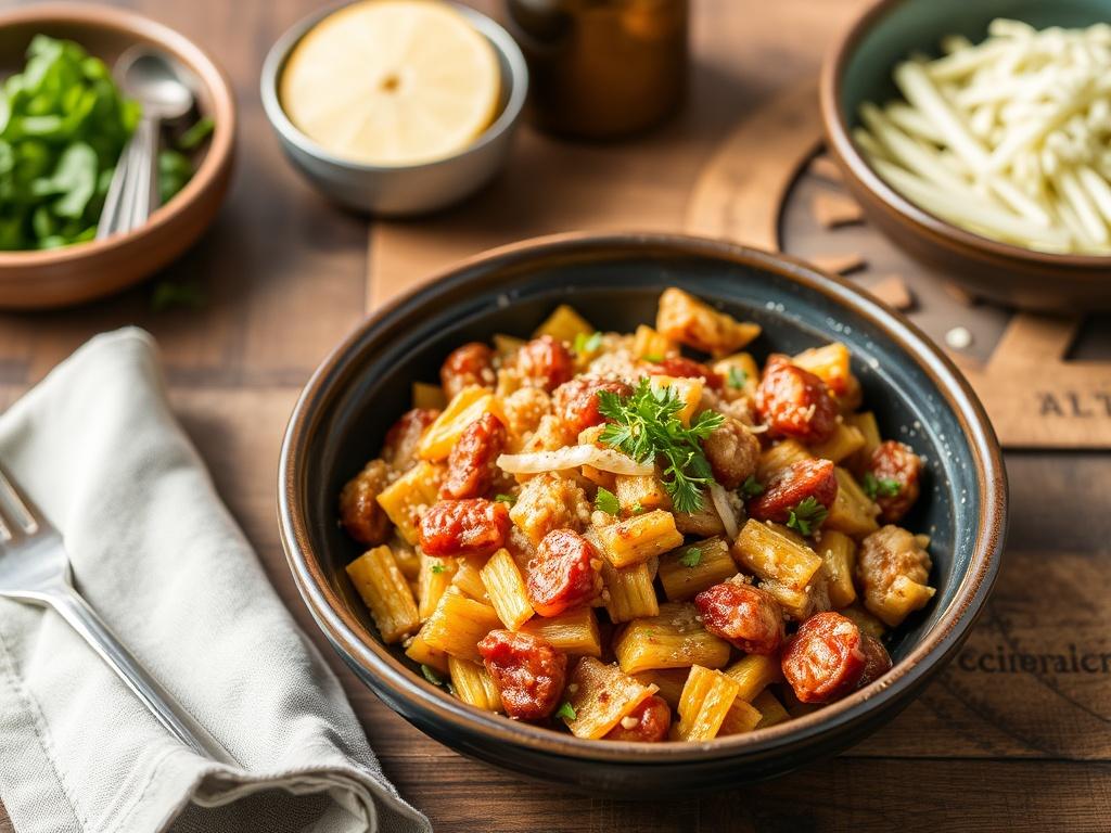 - Пошагово: обжарьте курицу, добавьте лук и чеснок, затем пасту и немного воды для подливки. Отдельно сварите киноа до готовности. Запеките морковь на 180 C около 25 минут. Соберите блюдо, полейте подливой и посыпьте зеленью.